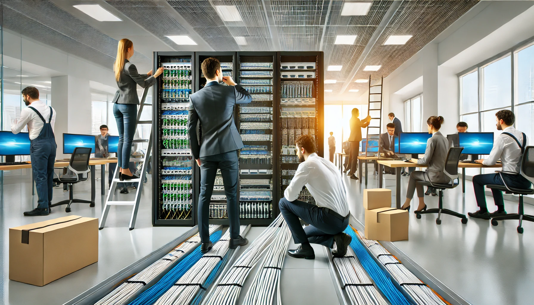 - Монтаж кабелей: Прокладка медных и оптических кабелей в офисах, промышленных зданиях и дата-центрах.